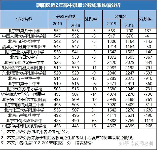 受中考试题难度的影响,2019年总体录取分数线下降。往年的八十中学和陈经纶中学齐头并进,变成了人朝和清朝迎头赶上的趋势,相信朝阳区高中的水平会不断的提升。