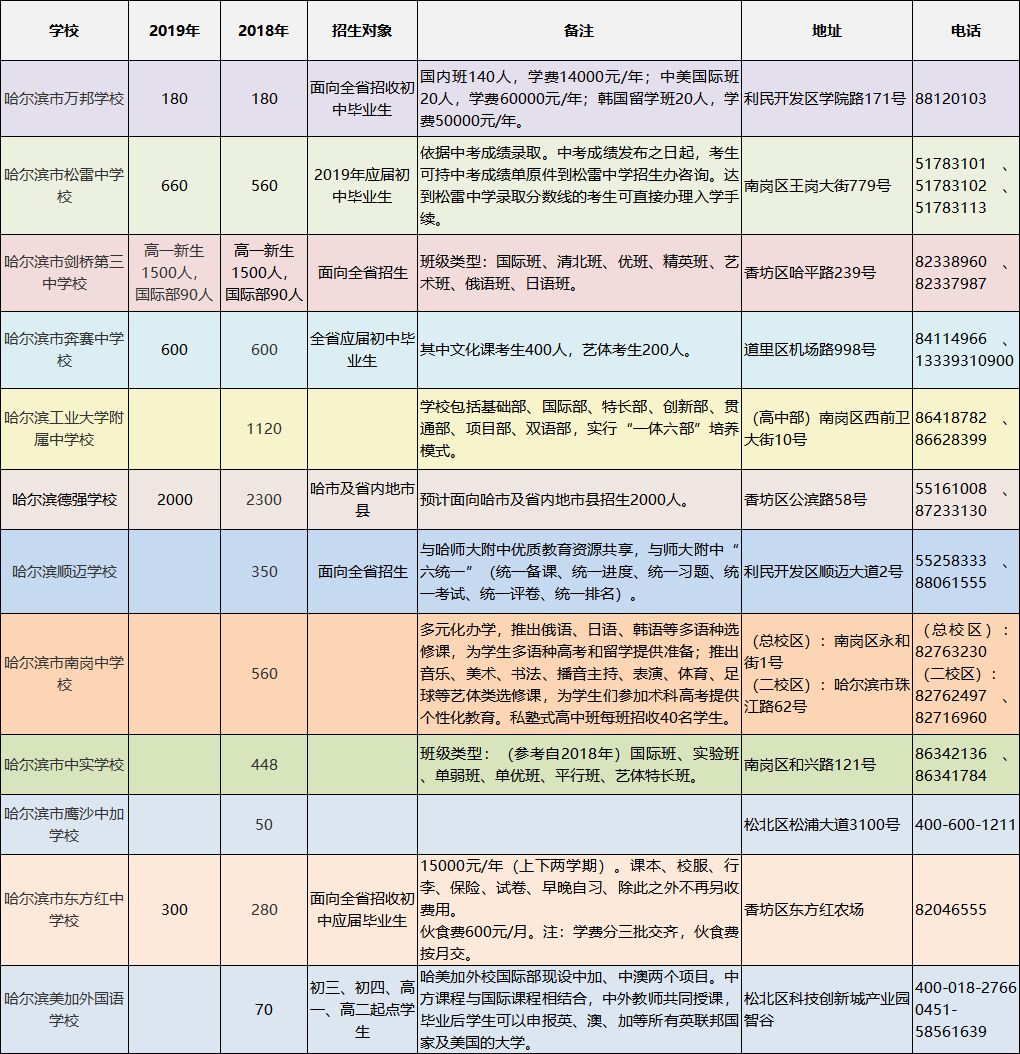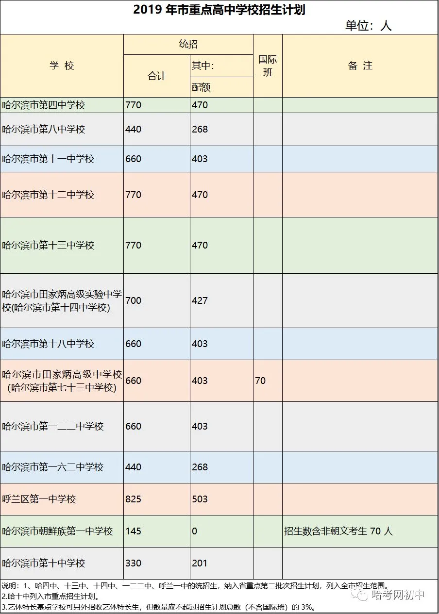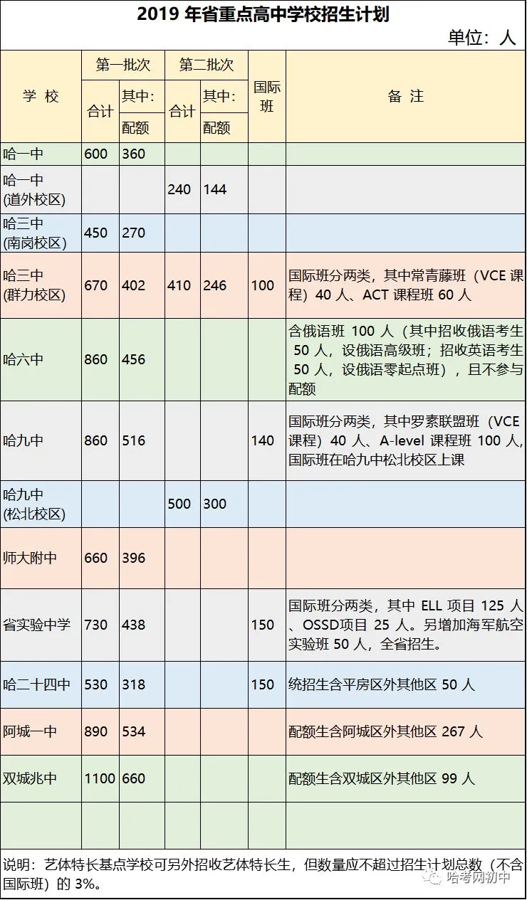 省重点高中第一批次学校:哈一中、哈三中南岗校区、哈三中群力校区(一)、哈六中、哈九中、哈师大附中、省实验中学、哈二十四中、阿城一中、双城兆麟中学统招生均面向市内九区招生。哈二十四中统招生主要招收平房区户籍考生,限量招收非平房区户籍考生(详见招生计划)。以上学校的配额生均按分配计划进行招生。