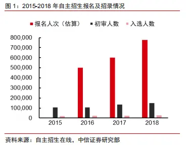 中信证券的研报显示,2018年全国自主招生的报名人数高达80万,然而每年最终通过考试的学生不足3万人。