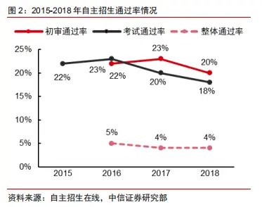 研报显示,从2015年至2018年,全国自主招生初审通过率从23%降至20%;考试通过率从23%降至18%。2016~2018年,我国自主招生整体通过率仅维持在4%~5%之间。