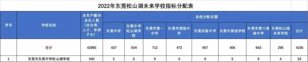 例如:东莞中学松山湖学校2022年招生人数为1100人,随迁子女为30人,自主招生为73人;东莞中学松山湖学校(初中部)户籍毕业生人数为540人;全市户籍毕业生为42985人。那么按照公式计算的话东莞中学松山湖学校分配数量为:(1100-30-63)x50%=503.5,那么东莞中学松山湖学校(高中部)分配到东莞中学松山湖学校(初中部)的名额就为:540x(503.5/42985)=6.3