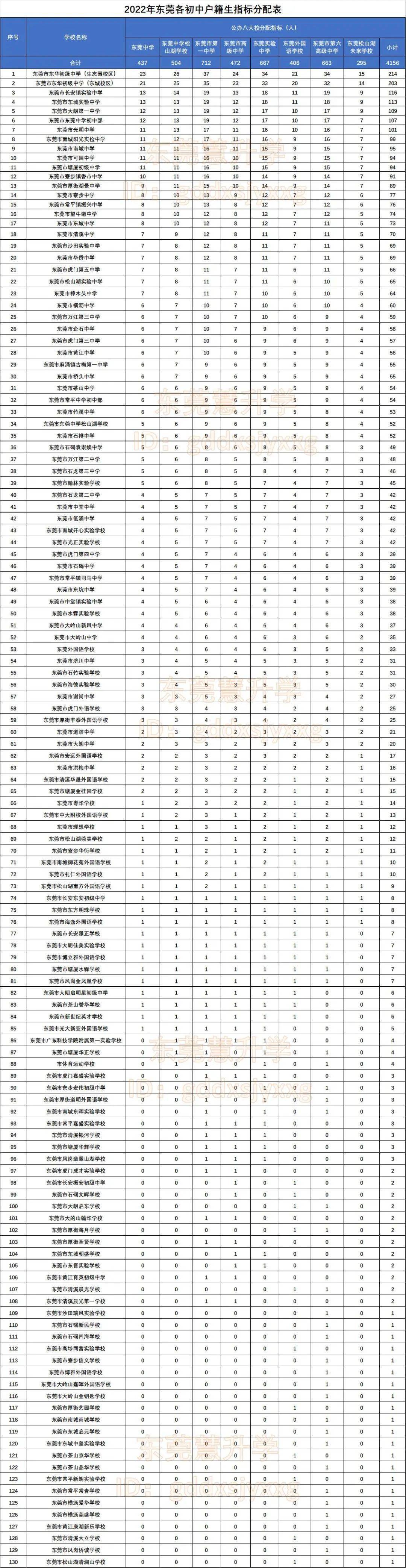 2022年,东华初级中学(417个)、长安镇实验中学(116个)、东城实验中学(113个)、大朗第一中学(109个)、东莞中学初中部(107个)、光明中学(101个)的公办八大校名额分配的数量是比较多的,都超过了100个。