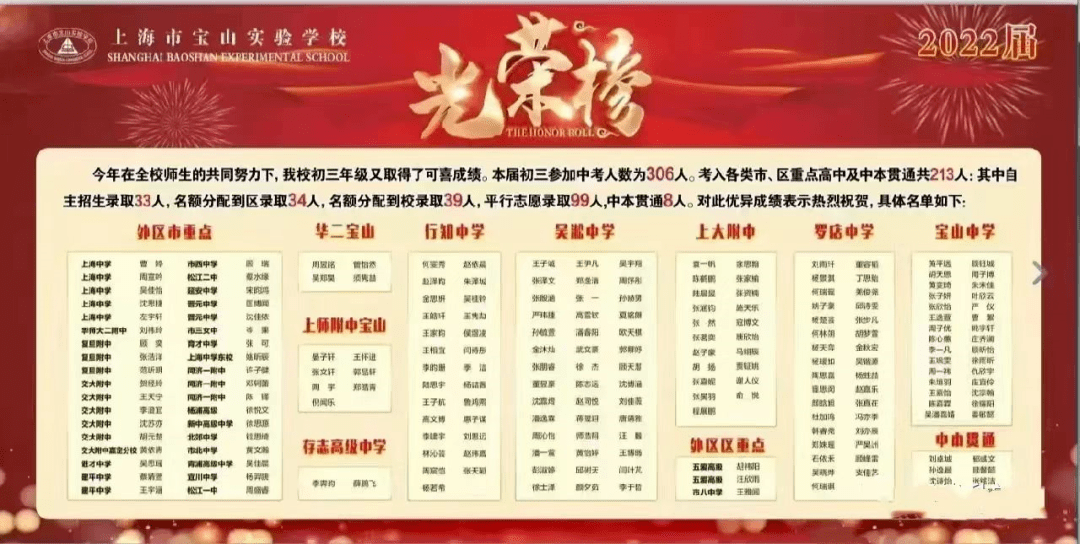 本届宝山实验参加中考人数共有306人,考入市重、区重及中本贯通共213人。其中自招33人,名额分配到区34人,名额分配到校39人,中本贯通8人。