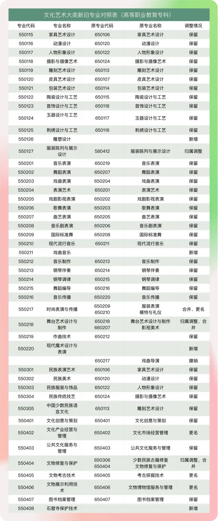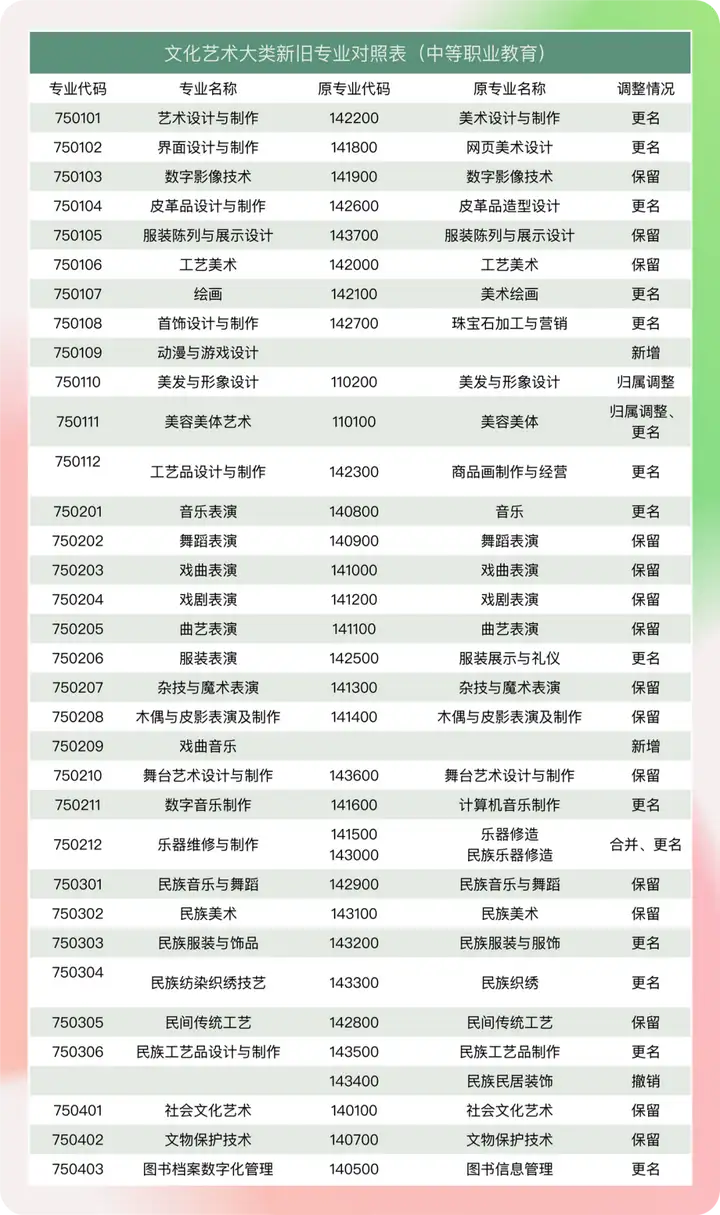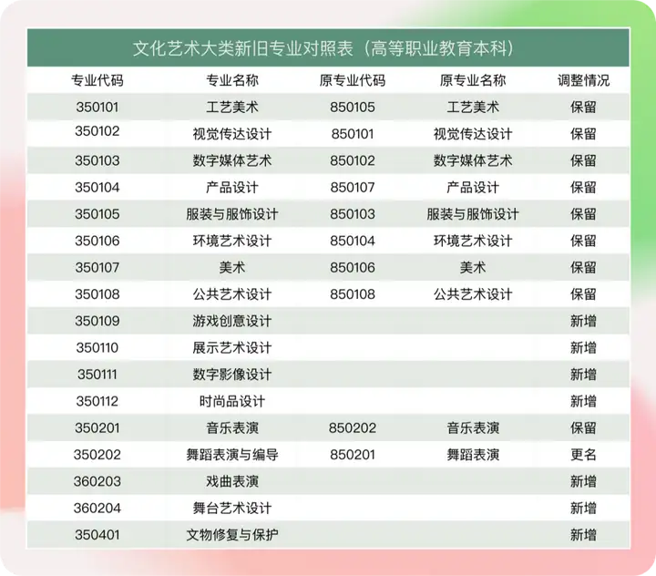 以下为最新文化艺术大类新旧专业对照表「如需获得全部内容可在艺考加后台回复“教育部目录”进入网站即可获取」