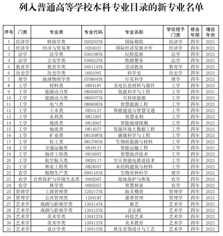 按照教育部公布的数据,31种新专业分别为:
