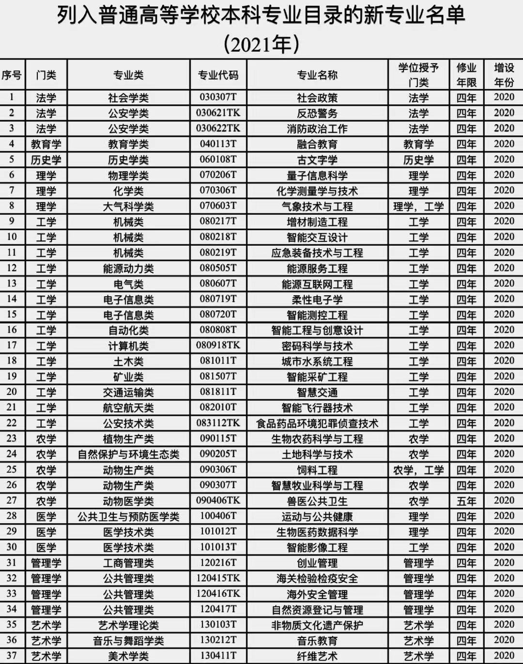 教育部公布的2021年高校招生专业目录显示,2021年共新增37个本科专业,43所高校通过了新增专业审批。新增专业中,约1/3是电子信息类和人工智能类,包括智能采矿、智慧交通、能源互联网等。