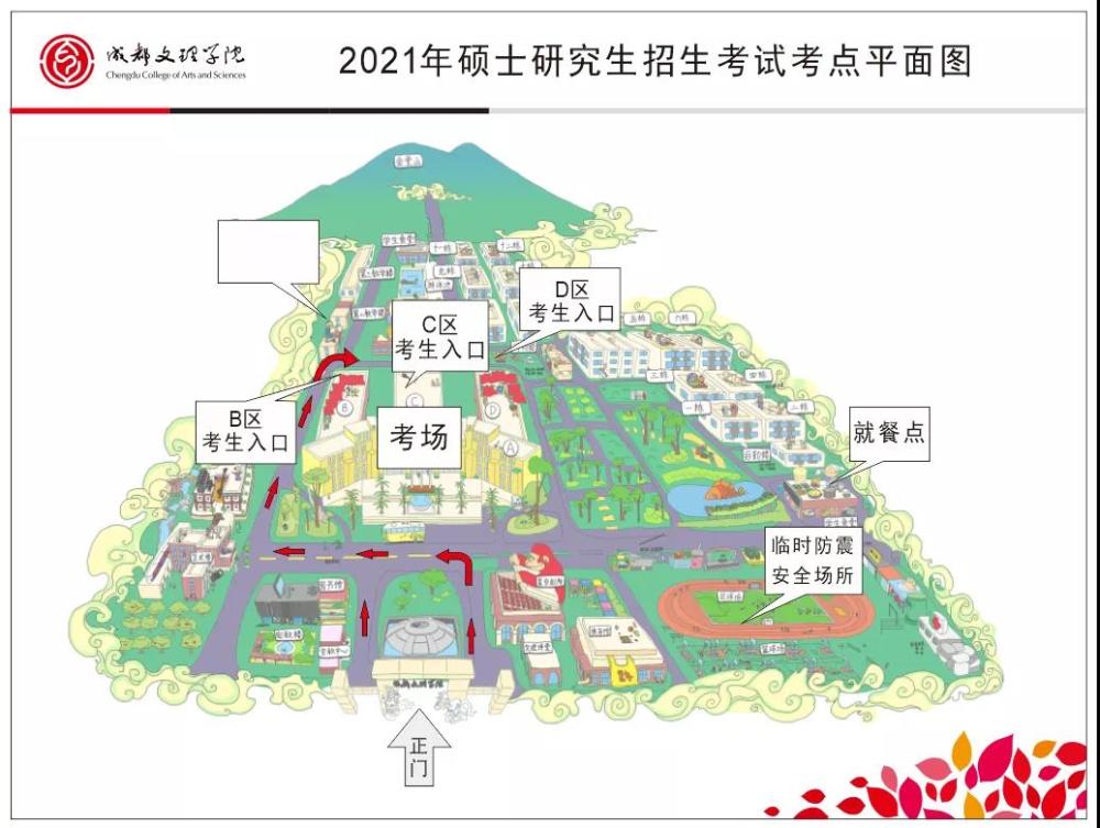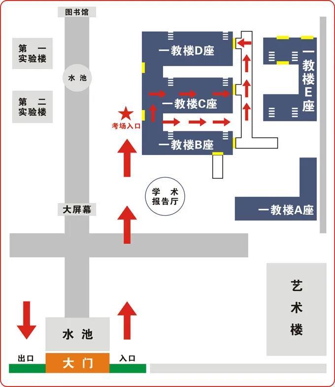 1、考点西大门(唯一开放大门)步行至博文楼(1-78考场)步行4分钟、至艺术传媒大楼(79-105考场)步行8分钟。