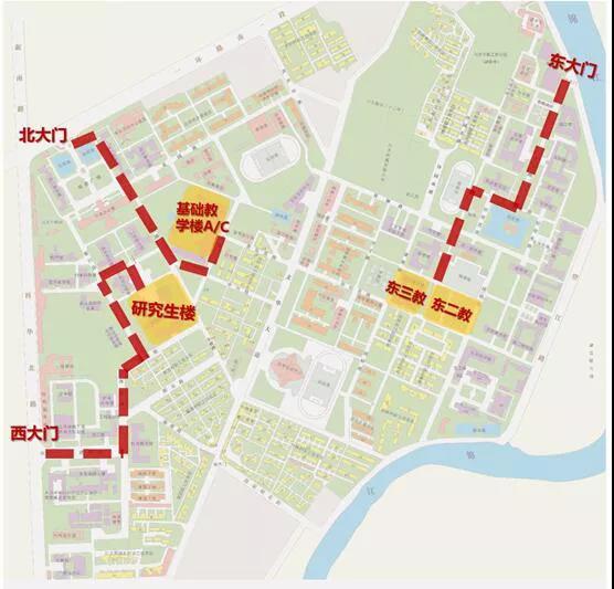1、考生专用通道,按指定路线到达考场(A4明德楼)健康防疫监测点,步行约7-8分钟;到达考场(A5勤工楼)健康防疫监测点,步行约9-10分钟。