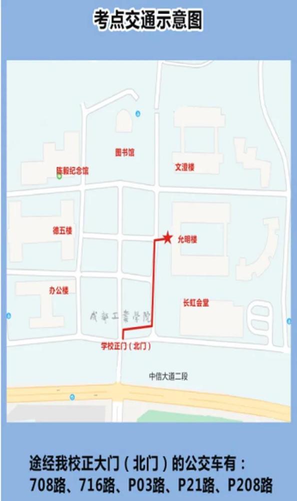 1、成都工业学校考点只开放正门(北门)供考生进出。进入大门后按照指示牌,步行约2分钟可到考试教学楼“允明楼”。