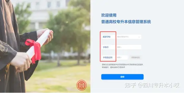 在登录系统时,需要填写就读院校和手机号码,并用手机收到的验证码登录。