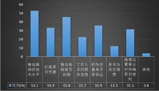 “工作人员的服务态度”和“是否为亲友推荐”及其他,占比率分别为22.7%、12.2%和3.8%。(由于该项调查为多选项,大部分受访车主选择维修时一般会考虑多项因素。)