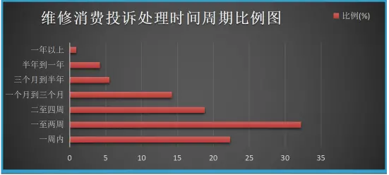 在汽车维修投诉纠纷方面,调查显示,从商家受理投诉到妥善处理,“一周内”解决的占22.3%,“一至两周”的占32.2%,两者合计占55.5%。