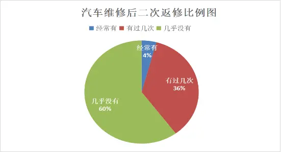 调查还涉及到返修问题。调查统计,有超过三成的受访车主表示自己的汽车有过二次返修的情况。其中“经常有”占4%;“有过几次”的占36%,“几乎没有”占60 %。