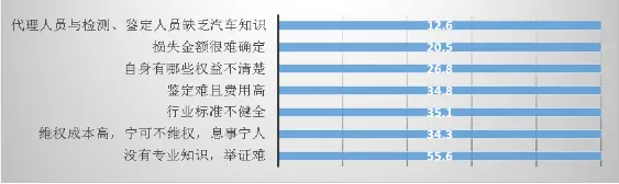 消费者维权遇到的主要障碍是:“举证难”,占55.6%;“维权成本高”,占34.3%;“行业标准不健全”,占35.1%;“鉴定难且费用高”占34.8%;消费者“不清楚自身权益”占26.8%;“损失金额很难确定”占20.5%等。