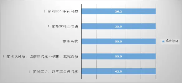 解决投诉过程中出现较多的情况是:“厂家钻空子,找车主自身问题”,占42.3%;其次是“厂家承认问题,但解决问题不积极,能拖就拖”和商家“霸王条款”成为处理的障碍,两者均占33.5%;“厂家商家相互推诿”和“厂家商家不承认问题”,分别占23.5%和26.2%。