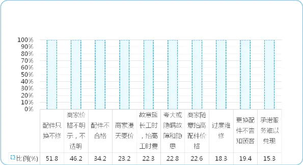 认为商家“随意抬高配件价格”“过度维修”“商家更换配件,事先不告知顾客”“承诺过的服务项目难以兑现”分别占22.6%、18.3%、19.4%、15.3%等。