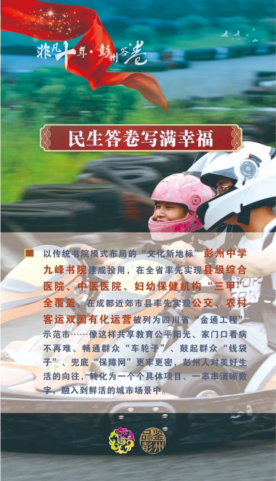 这十年,彭州发展迅速,彭州人的获得感和幸福感不断提升,以传统书院模式布局的“文化新地标”彭州中学九峰书院建成投用,在全省率先实现县级综合医院、中医医院、妇幼保健机构“三甲”全覆盖,在成都近郊区市县率先实现公交、农村客运双国有化运营,被列为四川省“金通工程”示范市……