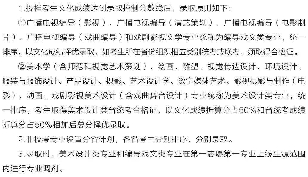 动画、动画(漫插画)、设计学类(含视觉传达设计、产品设计2个专业)、戏剧影视美术设计录取原则:贯彻德、智、体、美、劳全面考核择优录取的原则,在考生政治思想品德考核和体检合格的情况下,不实行平行志愿投档的省份按专业分和文化折算分5:5比例的综合分排序择优录取,综合分并列的按专业成绩从高到低择优录取。实行平行志愿投档的省份按各省相应统考类别(专业)平行志愿投档规则进行择优录取。