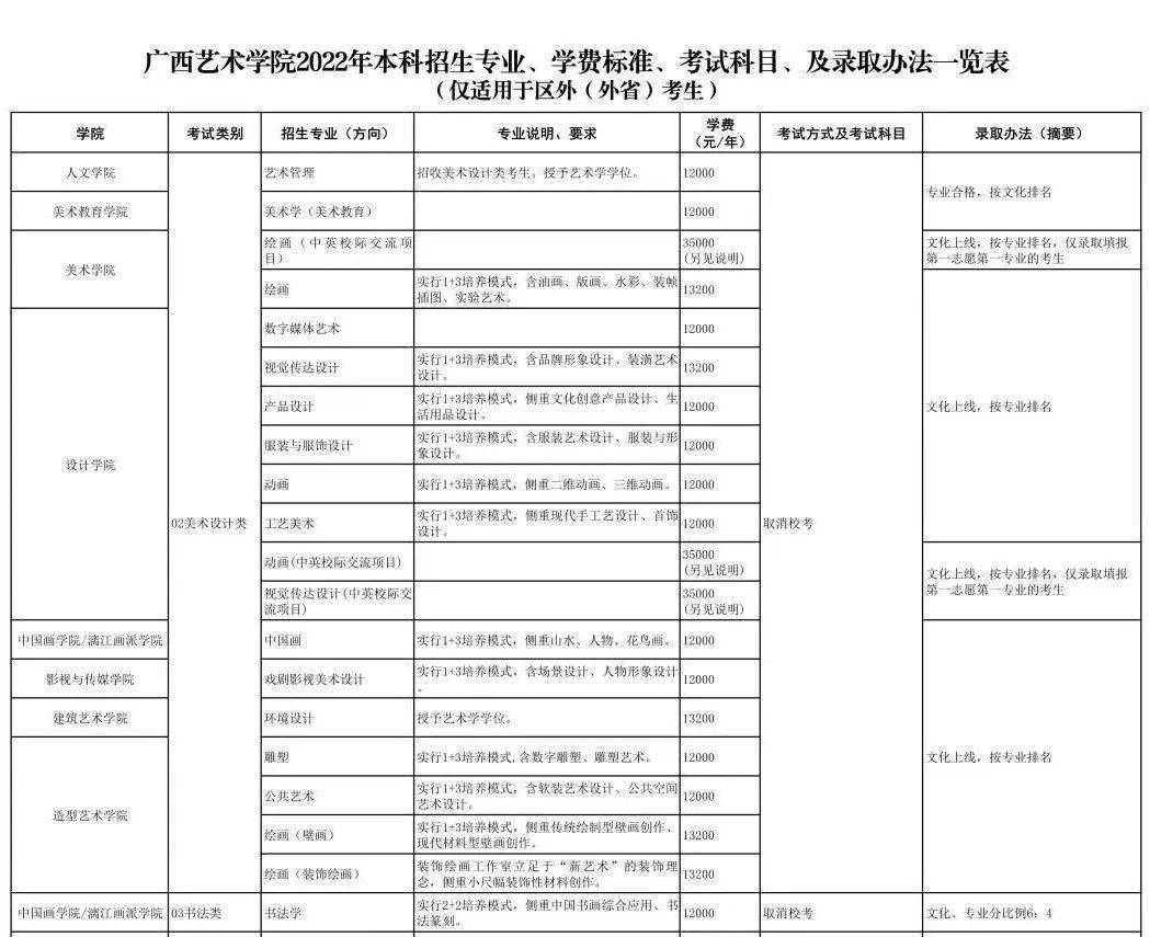 区外考生:美术设计类、书法类专业使用各省相应省级统考(联考)成绩,学校另行划定合格分数线。