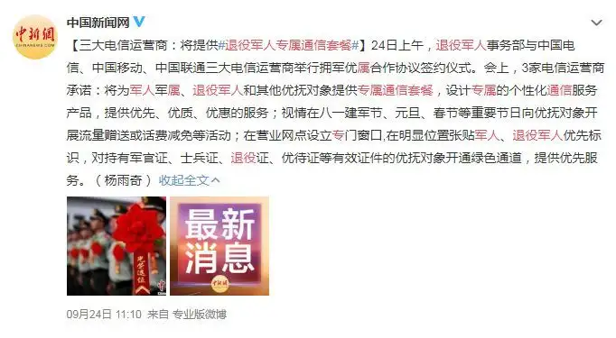 近日,退役军人事务部再次为军人军属、退役军人和其他优抚对象送上福利——退役军人事务部与中国电信、中国联通、中国移动3家电信运营商在京签署拥军优抚合作协议,将为军人军属、退役军人和其他优抚对象提供专属通信服务。