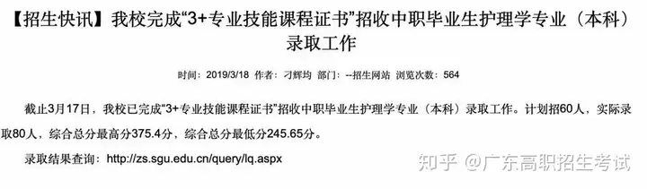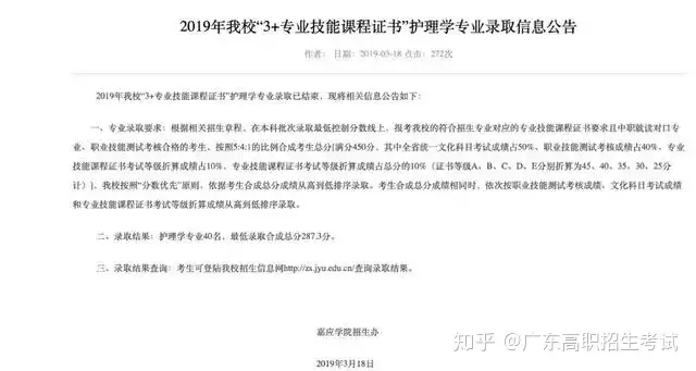 嘉应学校通过高职高考中职生护理学专业40名,最低录取合成总分287.3分。