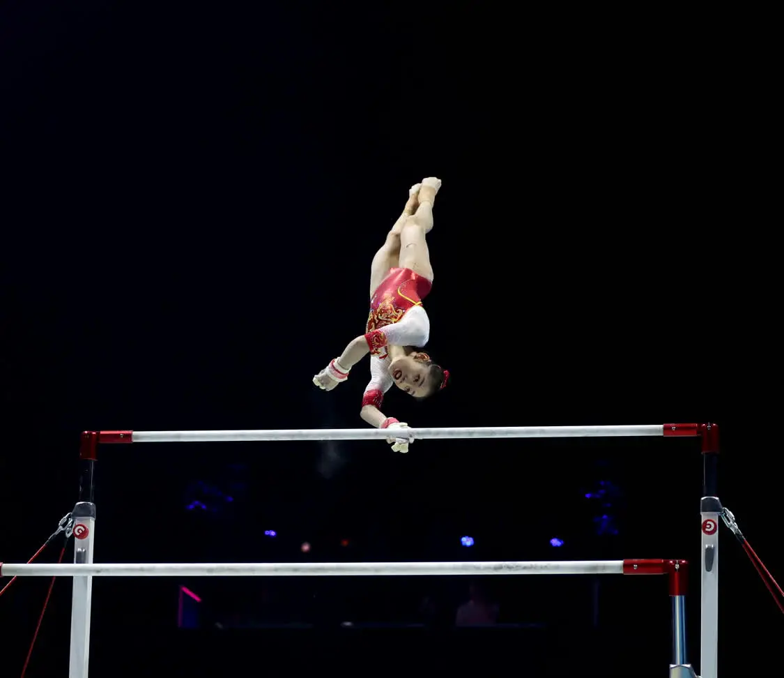 11月1日,中国队选手韦筱圆在女子团体决赛的高低杠比赛中。新华社记者 李颖 摄