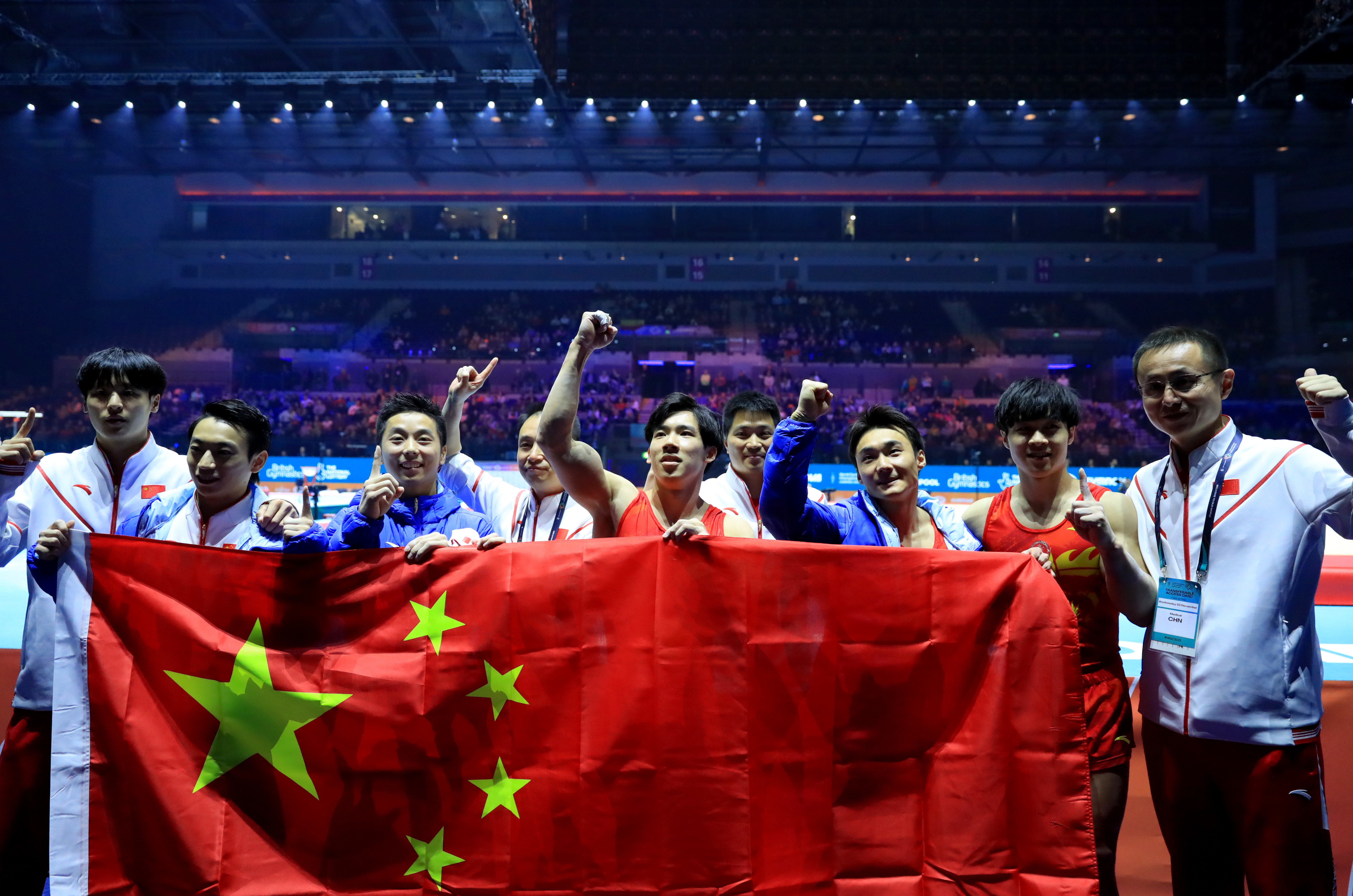 11月2日,中国队在男子团体夺冠后庆祝。新华社记者 李颖 摄