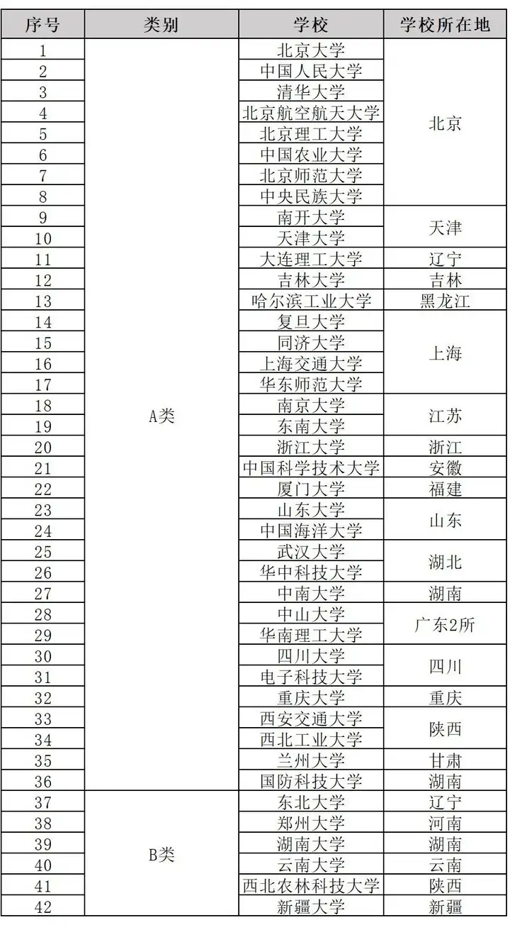 1世界一流大学从名单中可以看出,世界一流大学A类高校36所,且这36所高校以前全是985高校;B类高校6所,其中东北大学、湖南大学、西北农林科技大学以前为985大学,另外的郑州大学、云南大学、新疆大学以前为211大学。