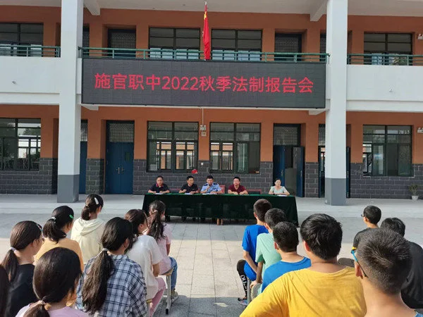 9月8日下午,来安县施官职中于教学楼广场前隆重举行了新学期开学典礼,并有幸邀请到施官派出所民警聂理民一行人给师生上了一节别开生面的“普法开学第一课”。