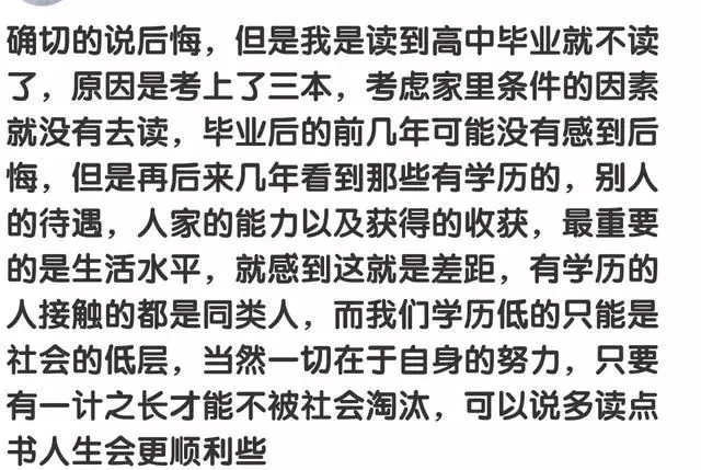 网友:说实在的挺后悔的,但是后悔是世界上最没用的东西,所以现在唯一能做的就是在闲暇时间多读点书。曾经还在学校读书的时候,整天想着出来社会打工赚钱。总想着每个月能有一两千块钱是多么幸福的事的是。即能买自己想要的东西,也能帮父母分担家庭。因为如此还跟父母吵过闹过。一直到真的出来社会打工了。才发现读书虽然改变不了人的起点,但却能改变人生的高度。我是中专学历毕业。这个学历在社会底层还算可以。但每当我想往上爬的时候,学历便成了我最大的障碍。不止是一本学历,也是知识的局限。也在此奉劝所有在校读书的朋友,好好读书真的能改变人生。虽然当你踏出校门的时候跟没读书的人一样在同一个起点,但是越往后你的学历以及你在学校学到的知识就会变成一块块砖头将你的人生一步步往上垫高。而没读书的人十年后可能还在原地踏步。也劝告过早离开学校的朋友。闲暇之余多读点书。这将会改变你的人生。书中自有颜如玉,书中自有黄金屋。