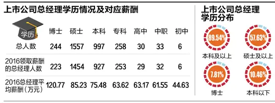 数据显示,上市公司总经理中本科以上学历占将近90%,硕士以上学历将近65%,而且学历越高收入越高。