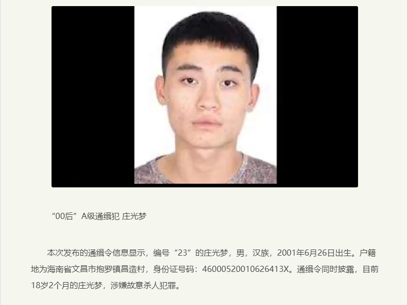 据报道,被通缉的庄某,2001年出生,刚满18岁,早先辍学后外出闯世界,却犯下故意杀人的重罪。