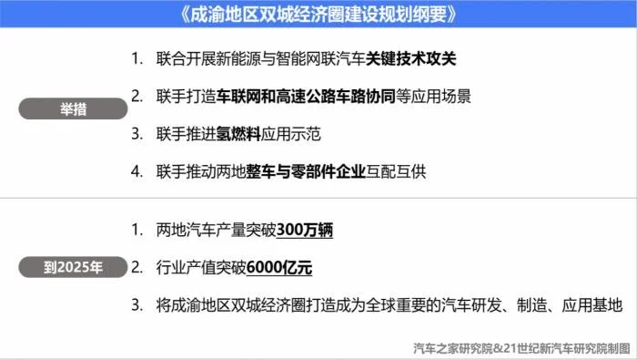《方案》要求成渝两地汽车产业协同发展,通过联合开展新能源与智能网联汽车关键技术攻关,联手打造车联网和高速公路车路协同等应用场景,联手推进氢燃料应用示范,联手推动两地整车与零部件企业互配互供等举措,到2025年力争两地汽车产量突破300万辆、行业产值突破6000亿元,将成渝地区双城经济圈打造成为全球重要的汽车研发、制造、应用基地。