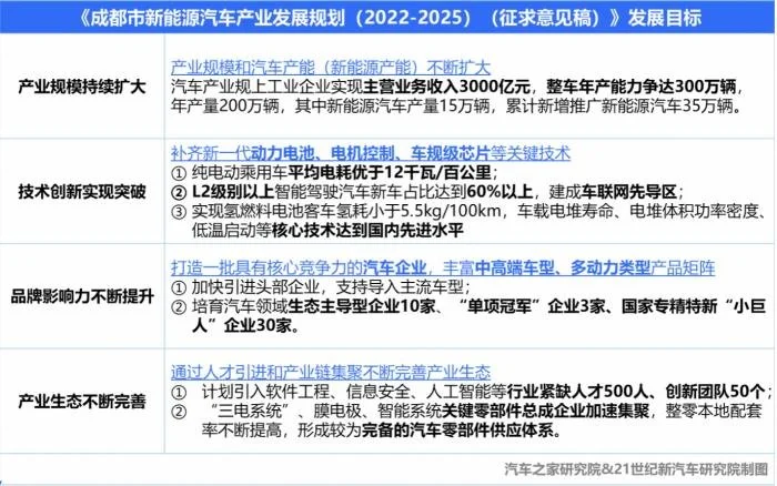 进入2022年,成都市经济和信息化局发布《成都市新能源汽车产业发展规划(2022-2025)(征求意见稿)》明确指出,结合成都新能源汽车产业发展实际,重点主攻纯电动汽车和燃料电池汽车方向,大力发展智能网联汽车。