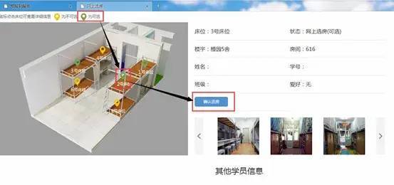 步骤4:点击绿色图钉标识即可选择相应床位,点击“确认选房”完成“网上选寝室”流程。