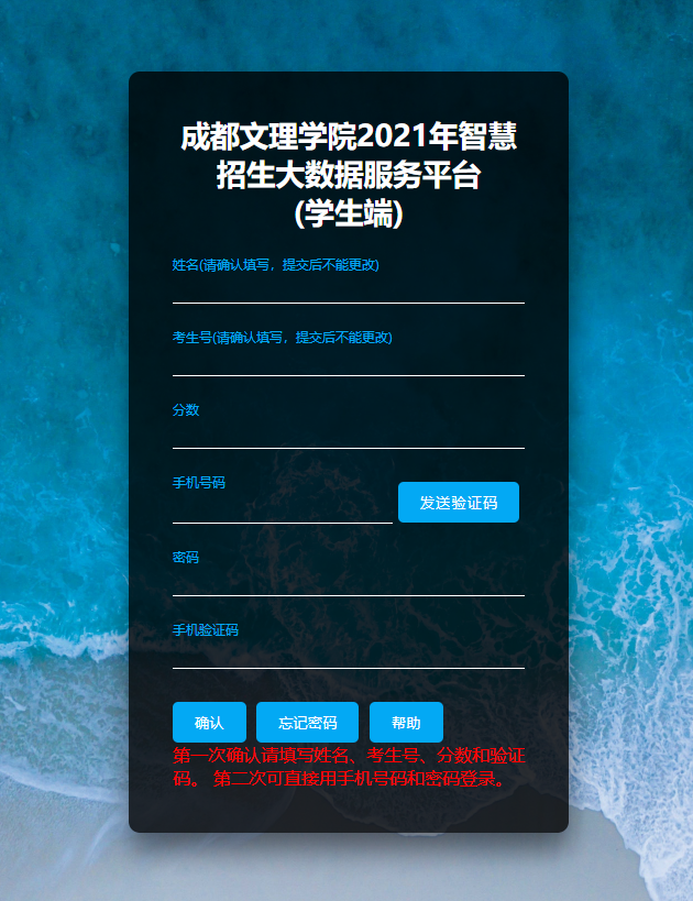 网址:成都文理学校智慧招生大数据服务平台http://bd.cdcas.com/aspx/cq/stulogin.aspx(建议使用IE高版本或兼容性较好的浏览器)