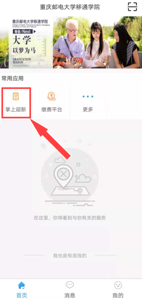步骤三:点击“掌上迎新”功能模块,开始掌上迎新报到流程。