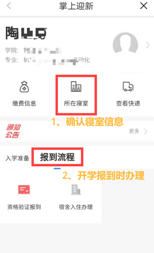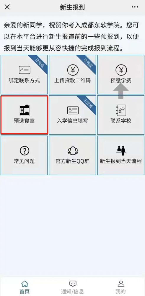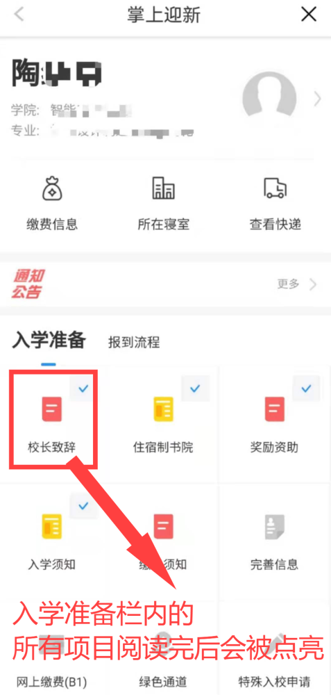 步骤四:“掌上迎新”包含缴费信息查询、所在寝室查询,以及入学准备和报到流程等模块,新生需依次顺序完成“入学准备”模块,完成一项后,会在功能模块右上角显示完成标识。前一步骤完成后才可解锁下一步骤,否则模块为灰色标识(不可操作点击)。入学准备全部完成后才可进入报到流程模块。