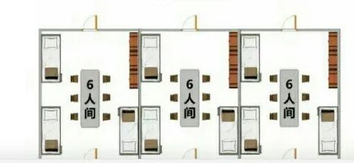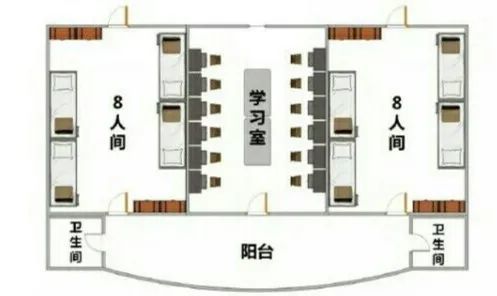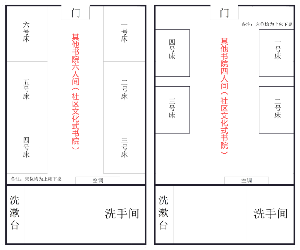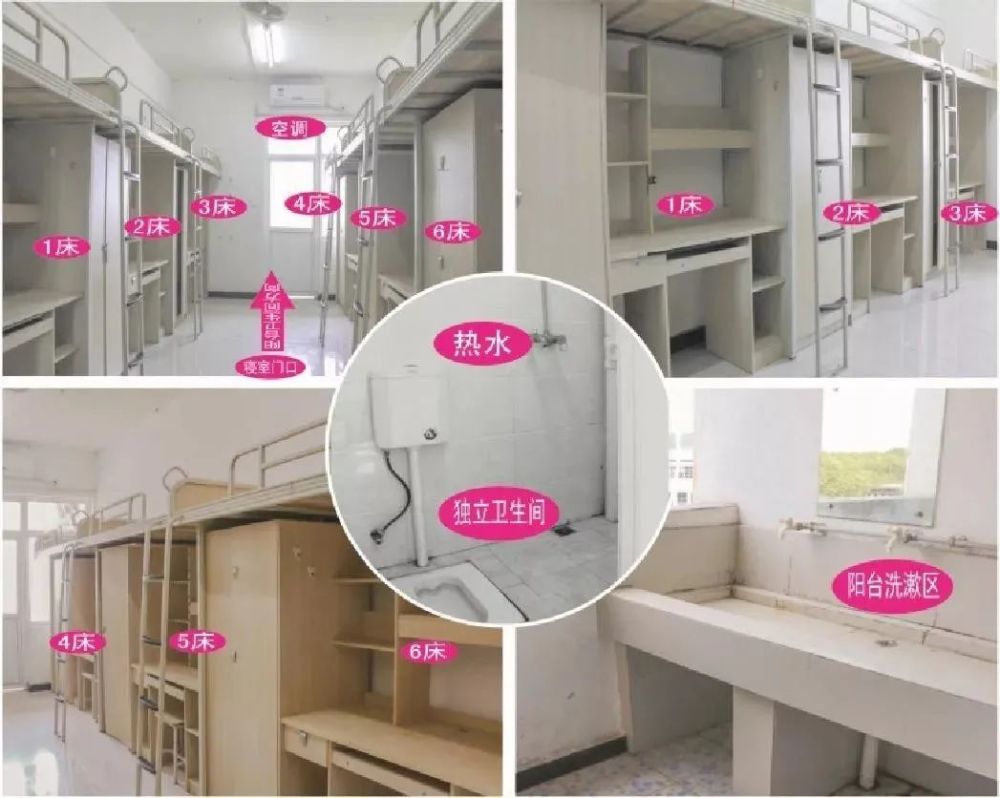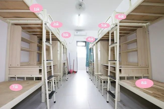 人数安排:女生宿舍大部分八人间,少部分六人间(上床下床);男生宿舍为六人间(上床下桌)。