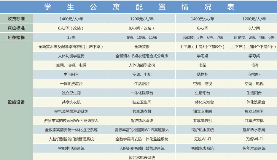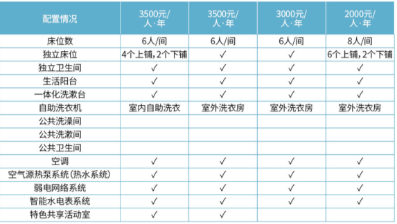 1、3500/人·年(六人间),公寓内配有上面床下面书桌和衣柜的独立床位(其中2个下铺)、空调、空气源热泵系统(热水系统)、独立卫生间、一体化洗漱台、独立阳台、特色共享活动室、智能水电表系统、弱电网络系统、室内自助洗衣机等现代化生活设施;