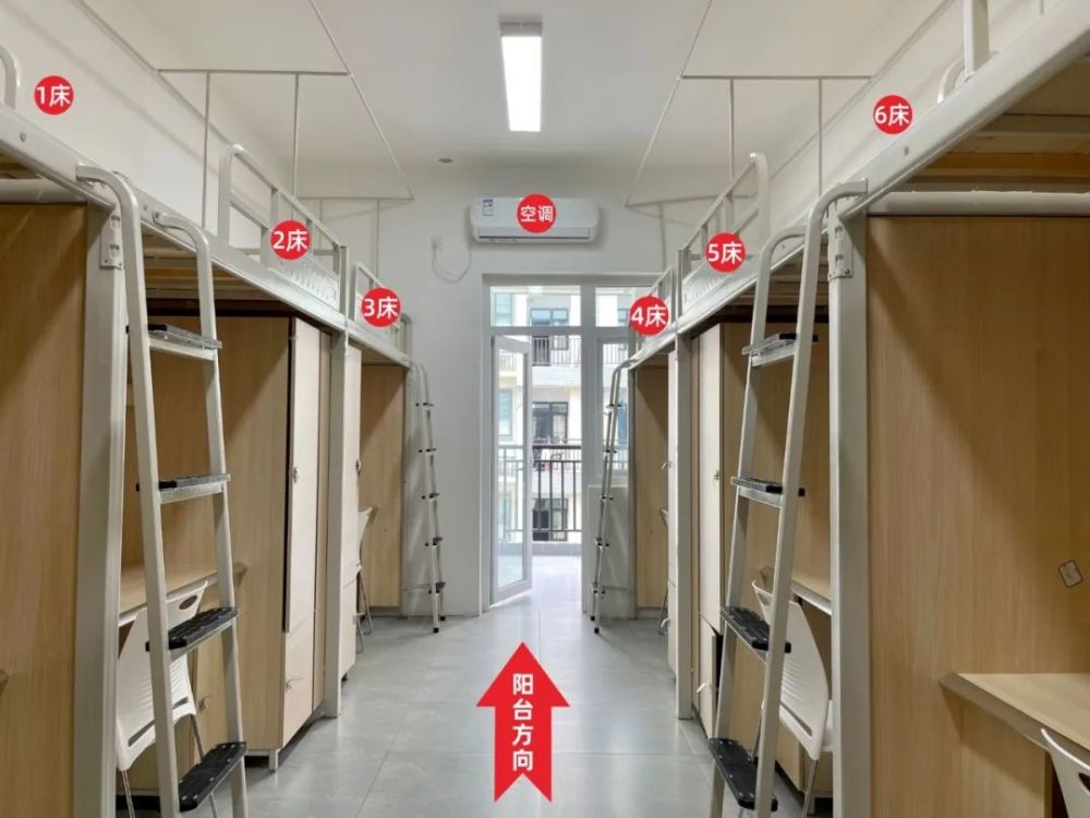 3、3000元/人·年(六人间),公寓内配有上面床下面书桌和衣柜的独立床位、空调、空气源热泵系统(热水系统)、独立卫生间、一体化洗漱台、独立阳台、智能水电表系统、弱电网络系统等现代化生活设施;