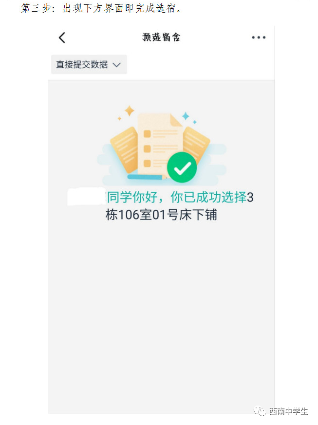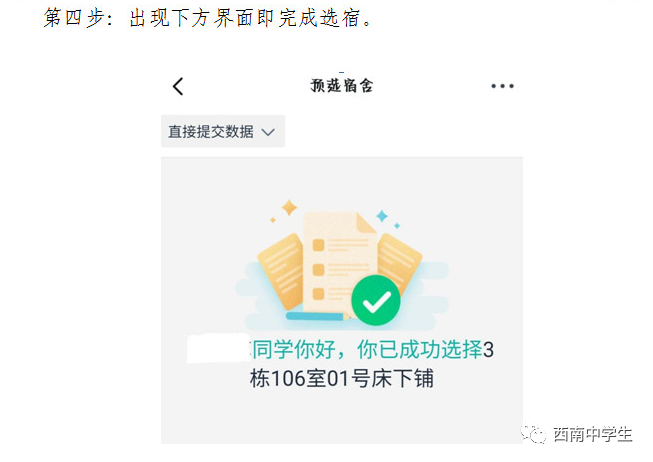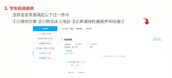 自选宿舍模块:在进行宿舍选寝后,点击可显示所选宿舍所在校区、楼栋和寝室编号,自选宿舍为线上选寝,环节共3个流程,请同学们依次操作。