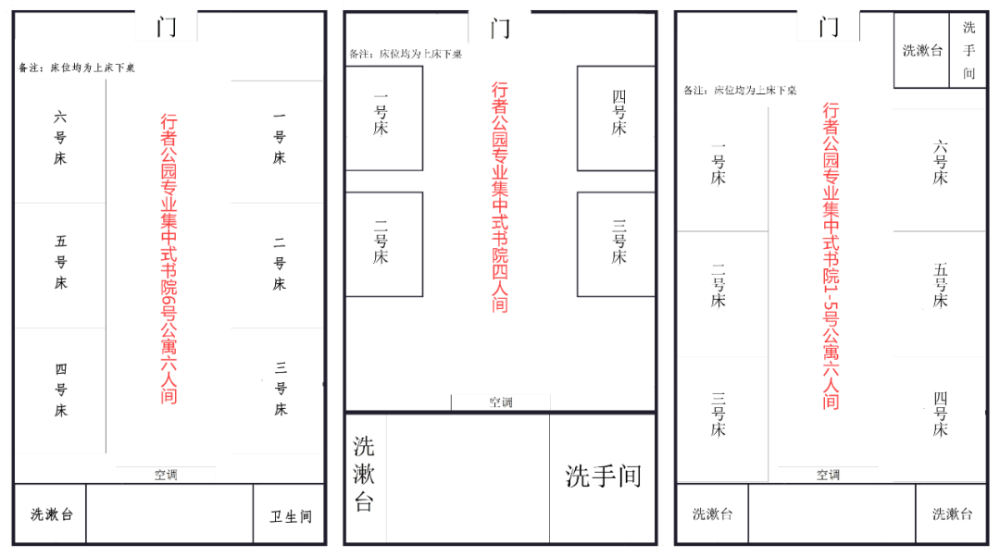 2、3500/人·年(六人间),公寓内配有上面床下面书桌和衣柜的独立床位、空调、空气源热泵系统(热水系统)、独立卫生间、一体化洗漱台、独立阳台、特色共享活动室、智能水电表系统、弱电网络系统等现代化生活设施;