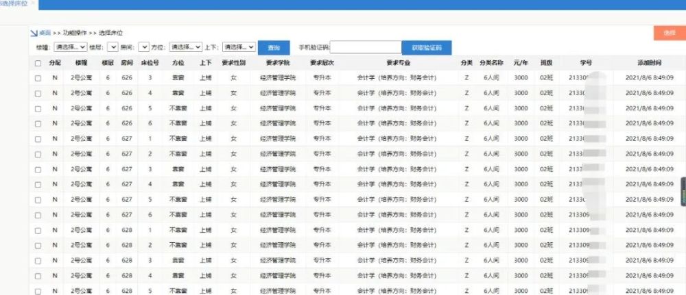 系统自动按照分性别、分层次、分专业显示可选择床位(同性别、同层次、同专业新生全部在同一区域)。凡通过“新生网上自助服务系统(选择寝室、床位)”成功选择寝室床位、班级的新生,学校将对其前4000名提供迎新报到一站式服务:新生到学校后由志愿者带领直接领取学校已提前准备好的迎新物品(缴费收据、体检表、校园一卡通、寝室钥匙、军训服装等),省去到学校迎新流中排队办理手续的麻烦。