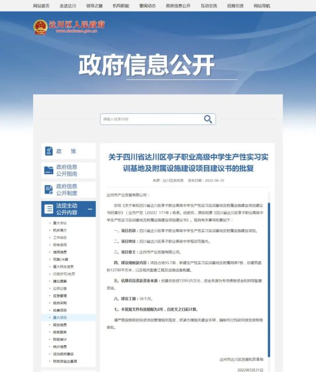 达川区政府官网6月10日公示的批复文件显示,该项目占地55.7亩,新建生产性实习实训基地及附属用房7栋,总建筑面积1.27万平方米,估算总投资7299.05万元,资金来源为专项债券资金和财政配套资金,建设工期为36个月,也就是三年时间。