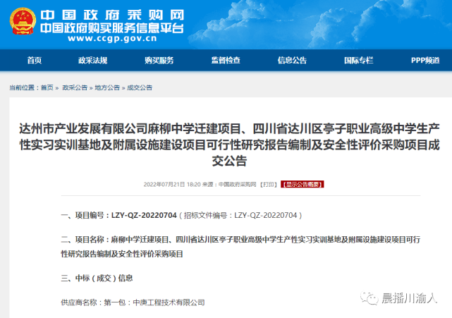 7月22日,中国政府采购网发布了亭子职业高中这一项目的可行性研究报告编制及安全性评价采购项目成交公告,项目可行性研究报告编制服务由四川诚研工程项目管理有限公司 实施,中标(成交)金额:6.92(万元),项目安全性评价由四川创安太平科技有限公司 实施,与麻柳中学迁建项目一起的中标(成交)金额为9.88万元,这两家公司均位于成都。均要求签订合同后,成交供应商30个日历天内完成项目可行性研究报告编制、报批及取得主管部门的批复。