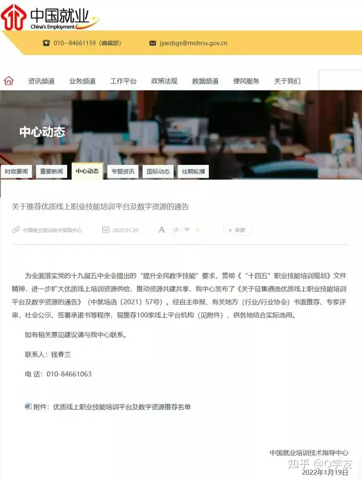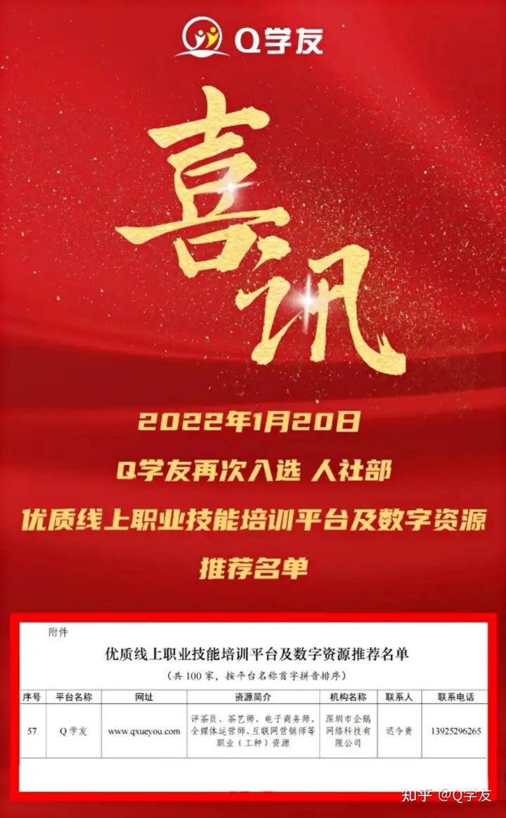 2022年1月20日,“Q学友”再次获得人社部推荐,入选全国优质线上职业技能培训平台名单。