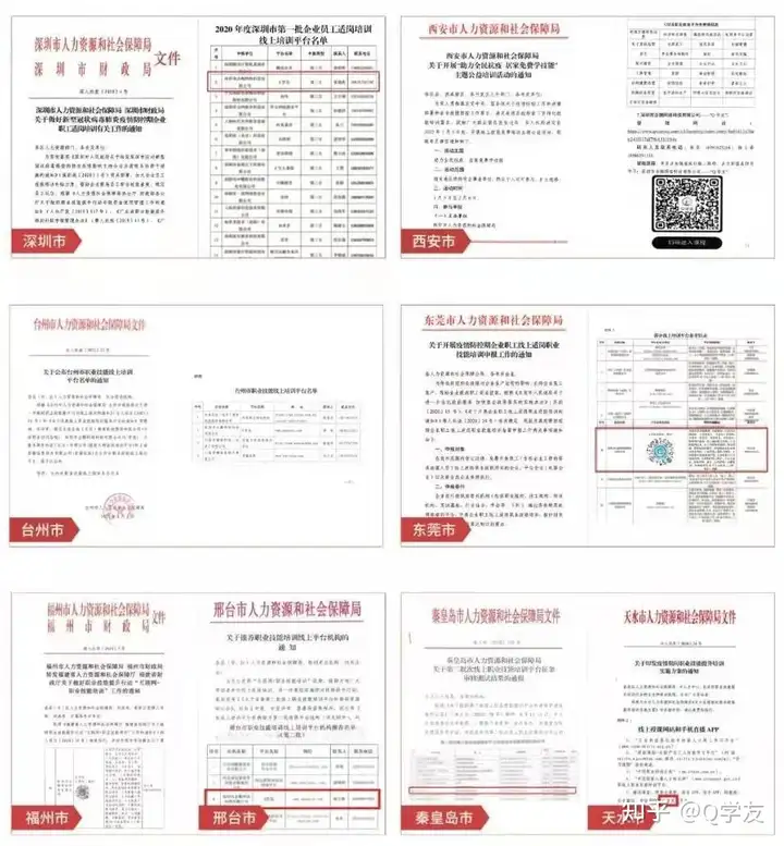 职业技能快速稳步的发展离不开国家人社部和各省人社厅的统筹领导,更需要各地市人社局深入贯彻执行到群众中去,Q学友积极配合各地市人社局展开职业技能提升行动,并获得了 8个地市 (包括 西安市、 深圳市、 东莞市、台州市、福州市、邢台市、秦皇岛市、天水市 )人社局的推荐为优质线上职业技能培训平台。