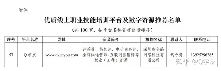 为全面落实党的十九届五中全会提出的“提升全民数字技能”要求,贯彻《“十四五”职业技能培训规划》文件精神,进一步扩大优质线上培训资源供给,推动资源共建共享, 2022年1月20日, 中华人民共和国人力资源和社会保障部中国就业培训技术指导中心 发布了《关于征集遴选优质线上职业技能培训平台及数字资源的通告》(中就培函〔2021〕57号)。经自主申报、有关地方(行业/行业协会)书面推荐、专家评审、社会公示、签署承诺书等程序, “Q学友”再次获得人社部推荐,入选全国优质线上职业技能培训平台名单。