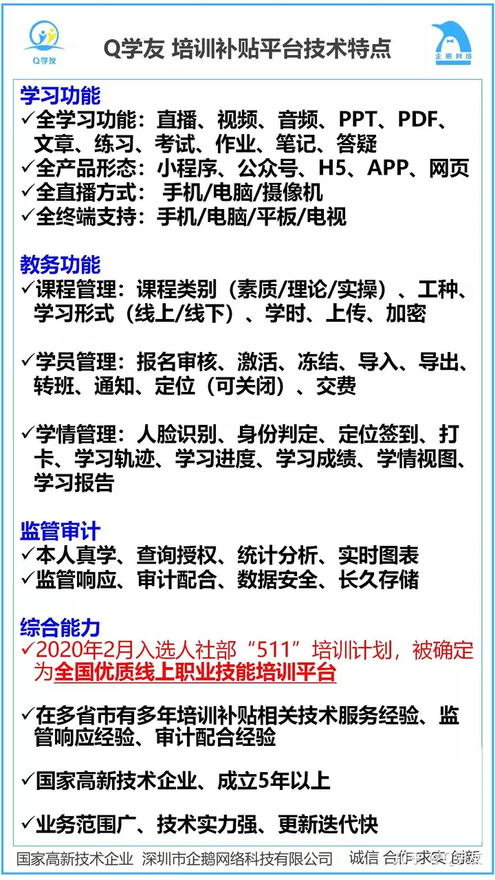 本次入选充分肯定了Q学友多年来深厚的产品积淀以及成熟的行业经验,也对Q学友的下一步发展提出了更高的要求。Q学友作为国家高新技术企业--深圳市企鹅网络科技有限公司的核心产品,必将再接再励,积极响应各地相关部门的号召,携手合作伙伴,为学校、机构、企业及各行各业从业人员提供专业、高效、高质量的线上线下混合式教学培训服务,助力职业技能提升行动持续开展,助力我国教育培训行业的数字化升级。